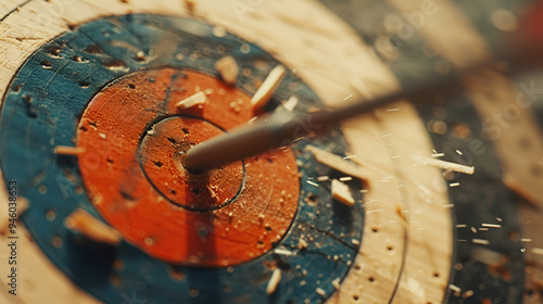 Close-up of an arrow being shot accurately into the target.