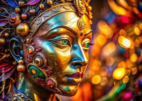Closeup of an Artistic Metallic Face Sculpture with Intricate Details and Golden Accents for Surreal Visual Impact
