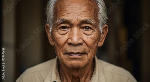 portrait, elderly, man, asian, face, eye, wrinkle, skin, hair, grey, brown, beige, shirt, expression, thoughtful, calm, serene, gentle, wisdom, life events, life, age, mature, senior, old, closeup, focused, detail, texture, light, shadow, studio, indoor, natural, look, direct, front, smiling, content, relaxed, quiet, hopeful, kind, authentic, simple, real, human, person, culture