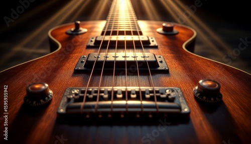 Close-up of an electric guitar with a wooden finish. The strings and pickups are clearly visible. Light beams create a dramatic effect.