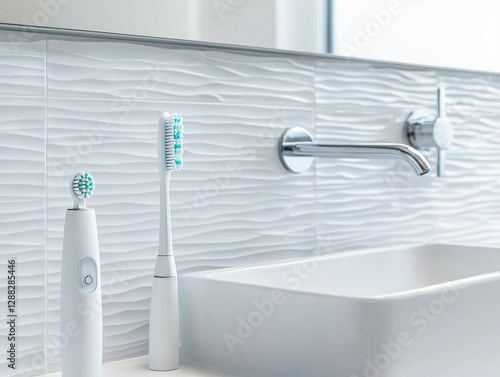 close, electric, toothbrush, toothpaste, modern, bathroom, set, promote, advance, oral, cleanliness, hygiene, whiten, wellness, beauty, fluoride, design, routine, convenience, freshness, aesthetic, cosmetic, lifestyle, save, upgrade, free, emphasize, softness, shower, decor, personal, bristle, product, foamy, supply, vibrant, comfort, refresh, stylish