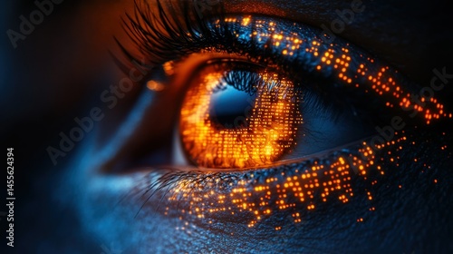 eye, glowing, digital, pattern, technology, futuristic, woman, closeup, beauty, make-up, orange, light, fire, bright, sparkle, detail, intense, beautiful, modern, art, illustration, design, graphic, creative, eyeshadow, lash, iris, vision, future, sparkling, patterned, detail, close, macro, dark, blue, fashion, style
