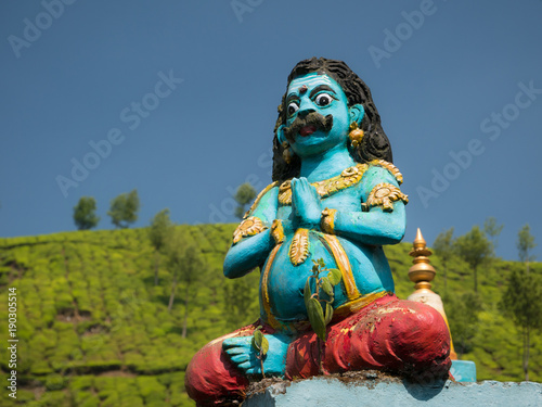 Close-up of an Indian statue with a background on tea plantations. Munnar, Kerala, India