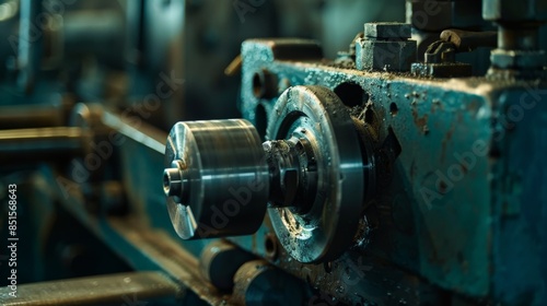 Close-up of an old, rustic industrial machine part in a factory setting. Highlighting mechanical details and vintage engineering craftsmanship.