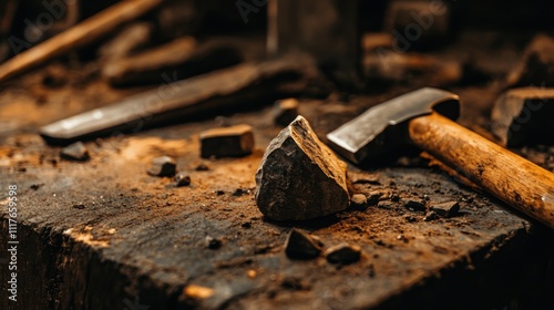 Close-up of ancient stone tools, sharp flint knives, and polished axes on a weathered wooden surface, symbolizing prehistoric craftsmanship and the dawn of human ingenuity