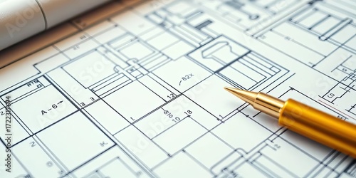 Close-up of architectural blueprint, technical drawing details, modern, template
