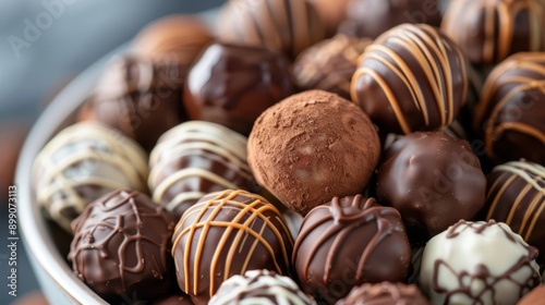 Close-up of assorted chocolate truffles in a bowl.