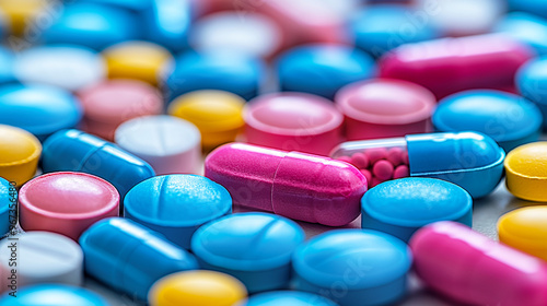 Close-up of assorted colorful pills and capsules in blue, pink, and yellow hues