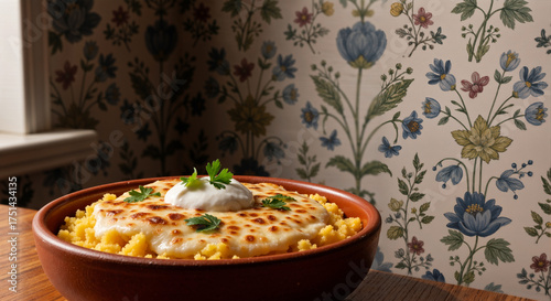 Close-up of baked polenta with melted cheese and sour cream in a terracotta bowl against floral wallpaper