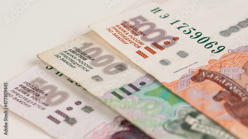 Close-up of banknotes. Five thousand, one thousand, five hundred rubles.