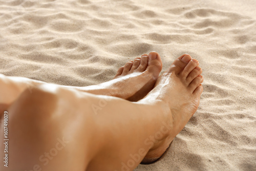 Close-up of bare feet resting on hot sand at the beach during a sunny summer day. Concept of relaxation, sunbathing, beach holiday, and peaceful vacation time by the sea.