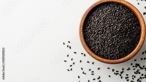 black, sesame, seed, wooden, bowl, closeup, bright, background, scattered, natural, presentation, organic, healthy, snack, texture, detail, culinary, food, ingredient, rustic, vibrant, no people