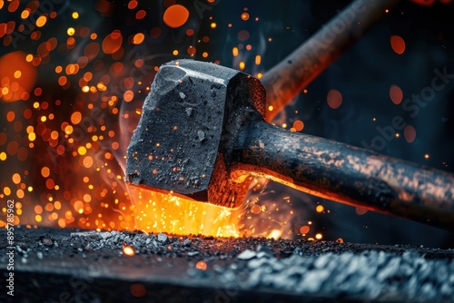 Closeup of blacksmith heavy hammer striking red hot piece of iron on an anvil. Blacksmithing, handwork, metal product