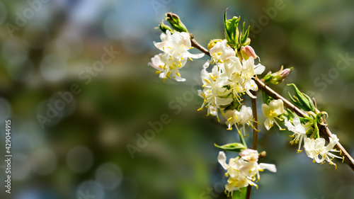 Close-up of blooming flower winter honeysuckle Lonicera fragrantissima (standishii), or January jasmine, Chinese honeysuckle. Flower against sun on background of beautiful natural bokeh