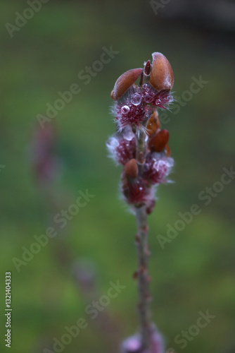 Close-up of blooming Japanese Willow pink flowers covered by raindrops. Salix gracilistyla 'Mt. Aso' on early springtime