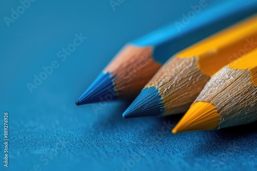 Closeup of blue and yellow sharpened colored pencils on a blue surface