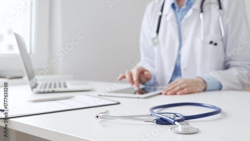Closeup of blue stethoscope is lying on the table near female doctor using a digital tablet and patient chart on the desk in a modern medical office, representing healthcare technology. Medicine