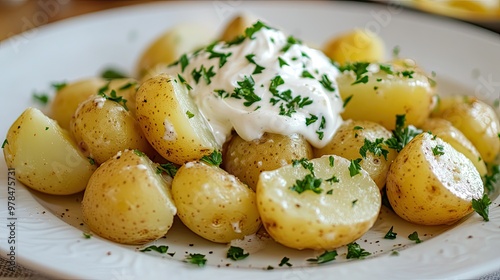 Close-up of boiled potatoes with creamy sour cream, sprinkled with chopped parsley on a white plate. The textures of the dish are inviting and fresh.