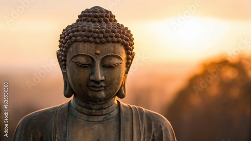 Close-up of Buddha’s serene eyes glowing in sunset light — inner peace and contemplation
