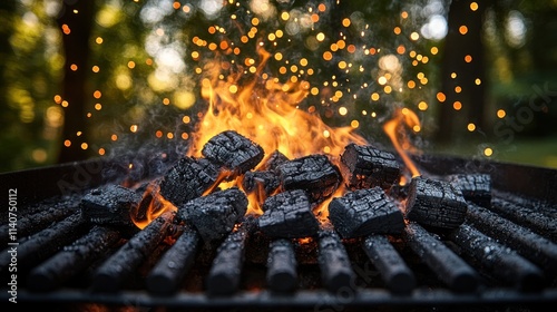 Close-up of burning charcoal briquettes on a barbecue grill with flames and sparks.