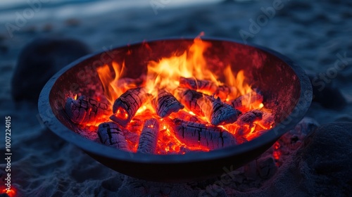 Closeup of burning embers in a metal bowl on a sandy beach.