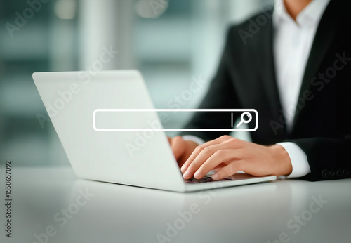 Close-up of businessman typing on laptop with virtual search bar interface. Concept of internet search, online research, information discovery, and digital business workflow. generative ai