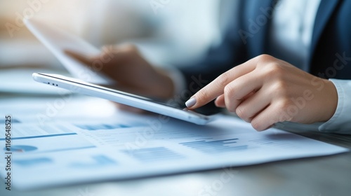 Close-up of businesswoman using tablet, reviewing financial charts and documents.