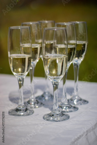 Close-up of champagne glasses filled with sparkling wine on a white tablecloth, ready for celebration at an outdoor event.