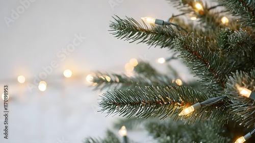 Closeup of Christmas tree branches with garland lights. Concept for Christmas, New Year, winter holidays. White minimalistic banner with copy space. Fir branches on white blurred background of lights