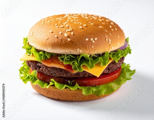 Close-up of classic hamburger with beef patty cheddar cheese tomato lettuce onion and ketchup stacked between sesame seed bun on white background for culinary and promotional visuals