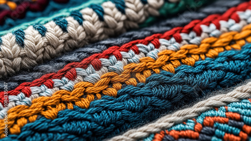 Close-up of colorful crochet pattern featuring various yarns in shades of teal, orange, red, and beige woven into textured rows