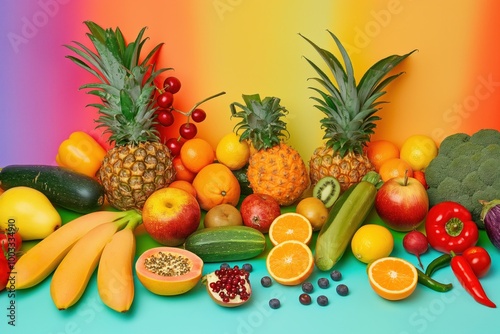 Close-up of colorful fruit and vegetable arrangement on rainbow background. Various types of fresh produce, including apples, avocados, cabbage, citrus fruits, and more.