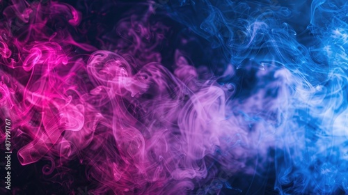 Close-up of colorful pink and blue smoke blending artistically on a black surface, ideal for backgrounds or artistic concepts
