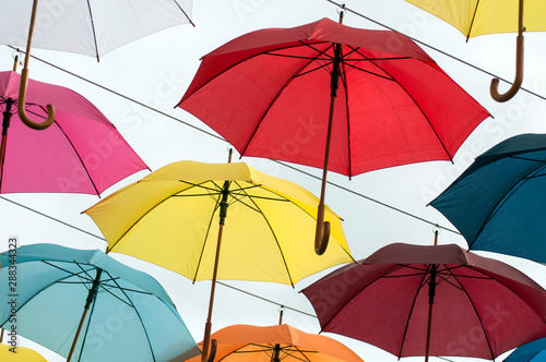 Closeup of colorful umbrella suspended in the street