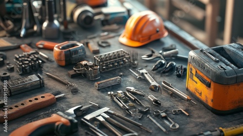 Close-up of construction tools like hammers, saws, and drills, emphasizing craftsmanship and tools of the trade.