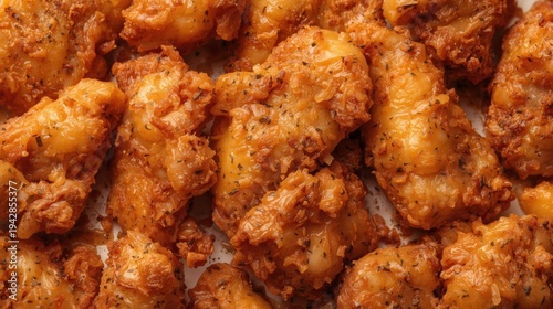 Close-up of crispy, golden-brown fried chicken wings seasoned with herbs and spices.