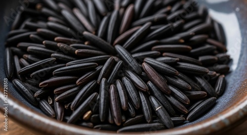 Close-up of dark wild rice grains in a bowl, showcasing texture and color variations