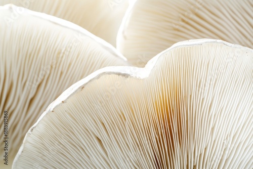 Close-up of delicate mushroom gills showcasing intricate structures and soft shadows, highlighting natural beauty and organic textures in a serene environment