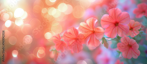 Close-up of delicate pink petunias bathed in soft, dreamy light, with a vibrant bokeh background of blue and pink hues. Banner, copy space.