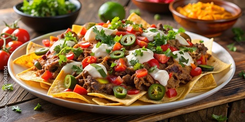 Close-Up of Delicious Beef Nachos with Cilantro, Tomatoes, and Sour Cream, Nachos, Mexican food, Appetizer