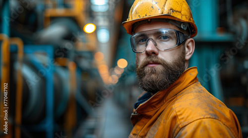 Close-Up of Determined Worker on Oil Platform. Close-up of a bearded oil rig worker wearing a dirty orange safety suit and goggles, embodying the dedication of the offshore workforce.