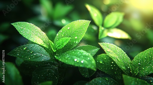 Close-up of dewy green leaves. Sunlight highlights vibrant foliage