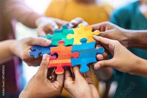 Close-up of diverse hands holding together a colorful puzzle, representing unity and collaboration