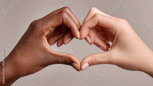 Close-up of diverse hands making heart finger sign, symbol of unity, love and inclusiveness on neutral background