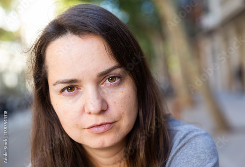 Closeup of dreamy face of attractive adult woman on blurred summer city street background