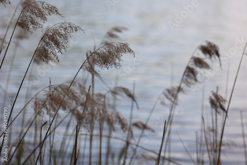 Close-Up Of Dry Common Reed Plumes With Feathery Seed Heads Gently Swaying Against A Calm, Reflective Water Surface. Serene Natural Lakeside Scenery.