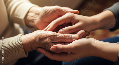 Close-up of elderly hands gently holding the hands of a younger person