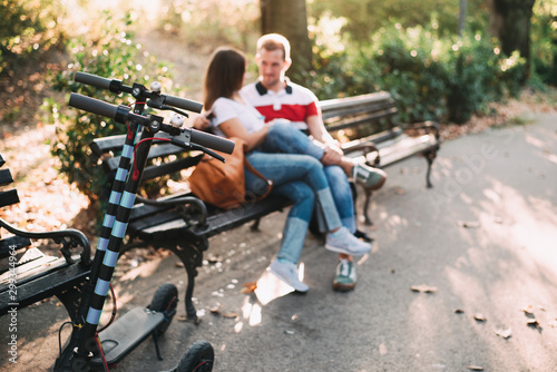 scooter, outdoors, bench, love, couple, young, jean, relaxed, loving, family, dating, hugs, affection, sunset, background, nature, park, smiling, boyfriend, photogenic, autumn, lover, girl, attractive, female, embracing, relaxation, romantic, summer, human relationships, man, woman, girlfriend, happy, romance, beautiful, 2, fun, lifestyle, closeup