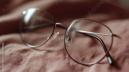 Close-up of elegant eyewear, silver frames resting on a soft pink surface, suggesting sophistication and clarity.