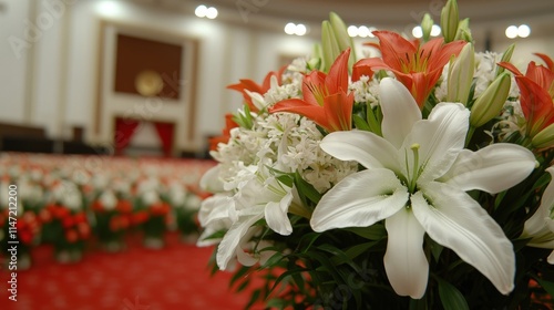 flower, lily, white, orange, red, bouquet, arrangement, floral, decor, hall, room, interior, event, ceremony, celebration, congress, government, politic, building, architecture, elegant, beautiful, sophisticated, festive, bright, vibrant, flower petals, blossom, bloom, spring, summer, nature, plant, design, wedding, anniversary, occasion, display, composition, sharpened, depth, background, carpet, stage, lighting, indoor